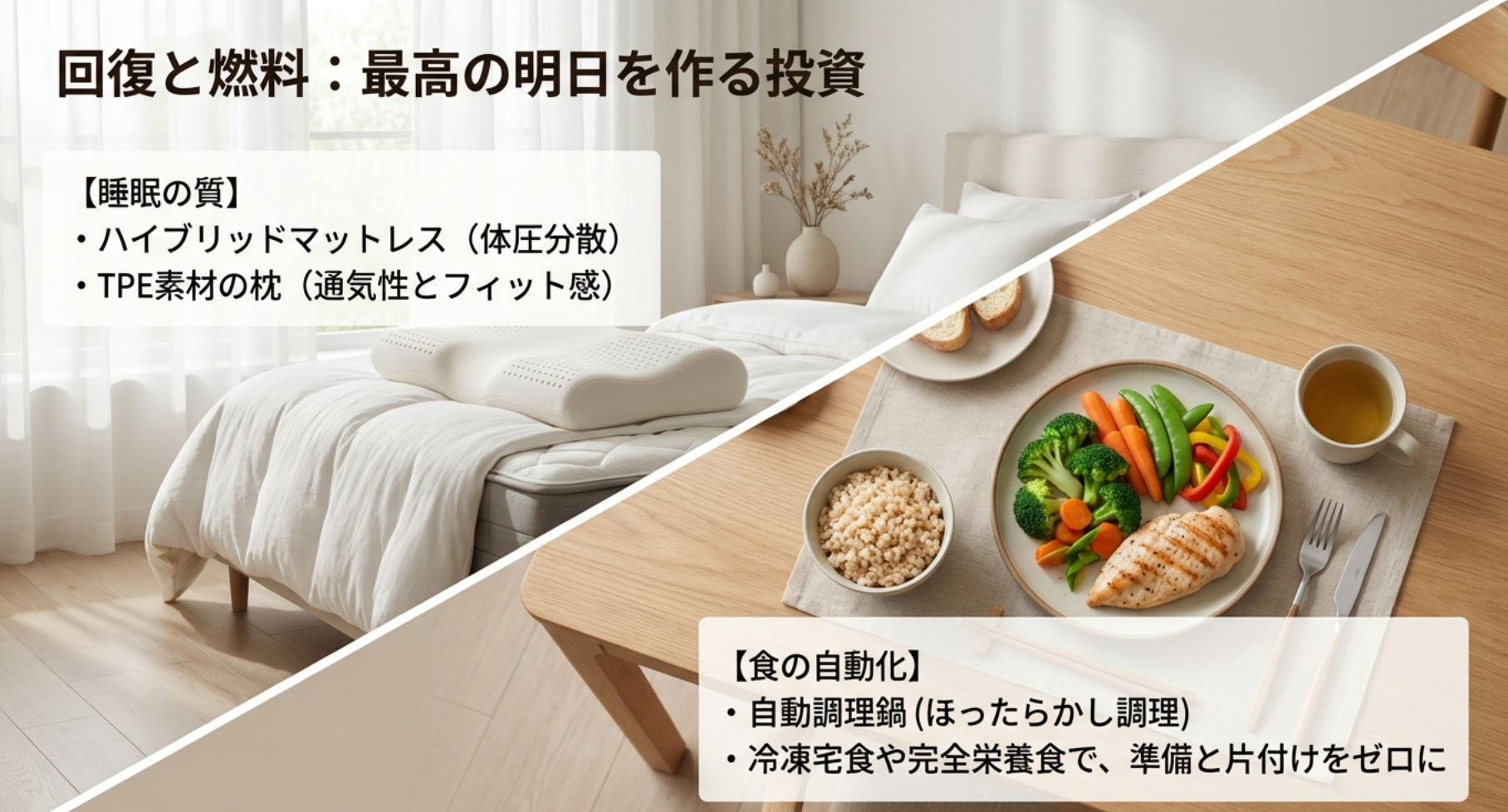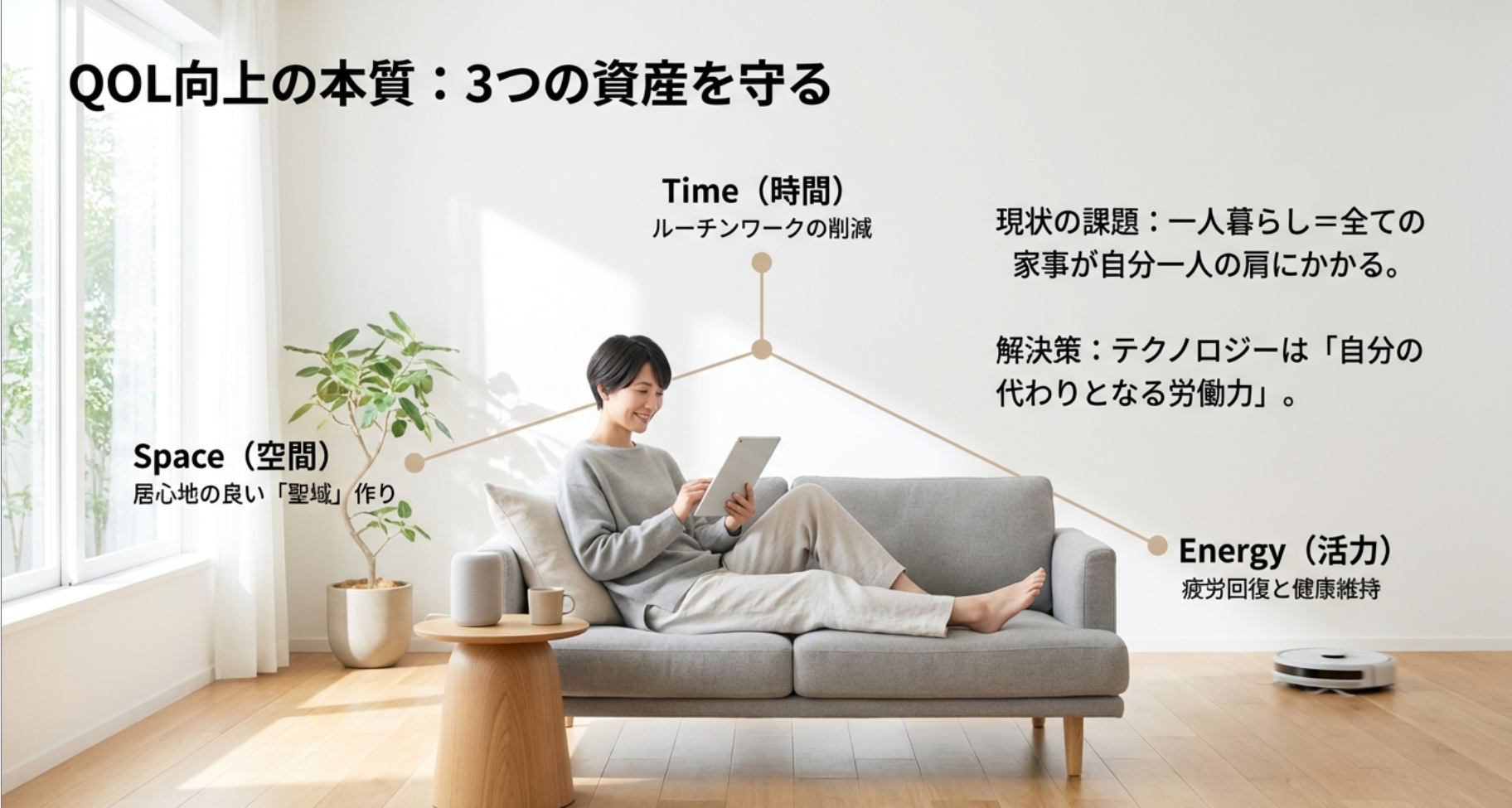 一人暮らしにおけるQOL向上の本質は、自分自身の「時間」「空間」「エネルギー」の三要素をいかに守り、育てるかにあります。家族がいる場合、家事は「分担」という解決策がありますが、一人暮らしではすべてが自分一人の肩にかかってきます。だからこそ、テクノロジーやサービスへの投資は、文字通り「自分の代わりとなる労働力」を雇うことに等しいのです。