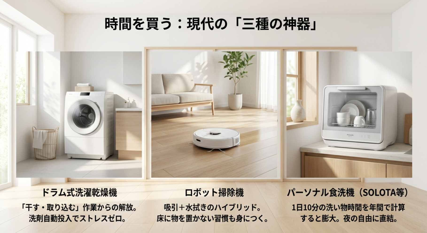 そして、意外と盲点なのが「パーソナル食洗機」です。パナソニックの「SOLOTA(ソロタ)」に代表される、A4サイズ程度のスペースに置ける超小型モデルが登場しています。一人分の食器を洗う時間はわずか10分程度かもしれませんが、その10分を毎日、毎食積み重ねると年間では膨大な時間になります。食後の「あぁ、洗わなきゃ」という重たい気持ちが消えるだけで、夜の自由時間はもっと軽やかになります。