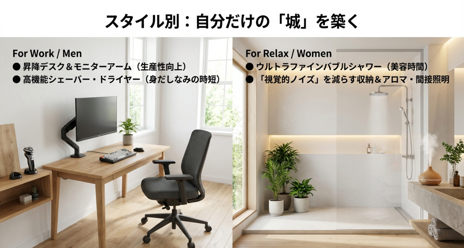女性の単身世帯では、自宅を「世界一安心できるリラクゼーションスペース」にすることがQOL向上の鍵です。まずおすすめしたいのは、高機能シャワーヘッドです。ミラブルなどのウルトラファインバブルを生成するモデルは、日々のバスタイムをエステのような美容時間に変えてくれます。お風呂上がりの肌のしっとり感や、髪のまとまりが良くなるだけで、鏡を見るのが楽しくなるはずです。