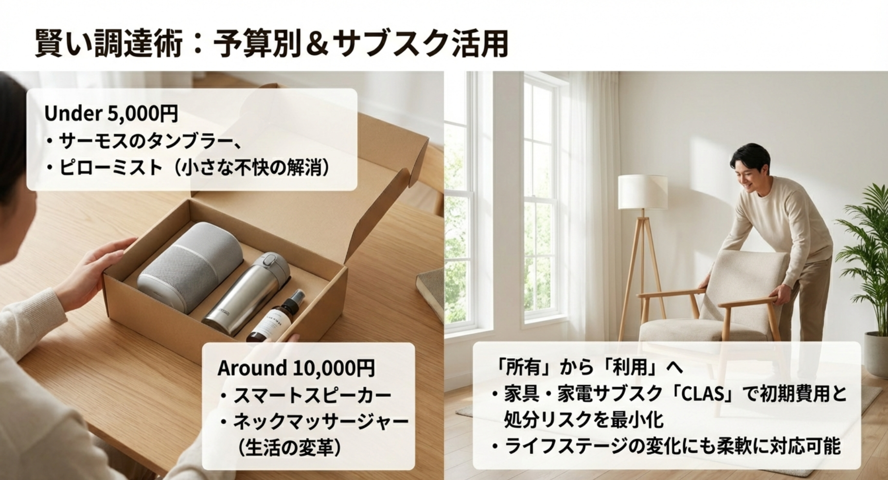 また、最近では「所有する」というリスクを避けながら、最新の生活を体験できる仕組みも整っています。一人暮らしはライフステージの変化が激しい時期でもあります。引っ越しの際の手間を考え、身軽さを維持しながら質を上げるという、現代的なアプローチも合わせてご紹介します。賢い選択で、賢く生活のレベルを上げていきましょう。