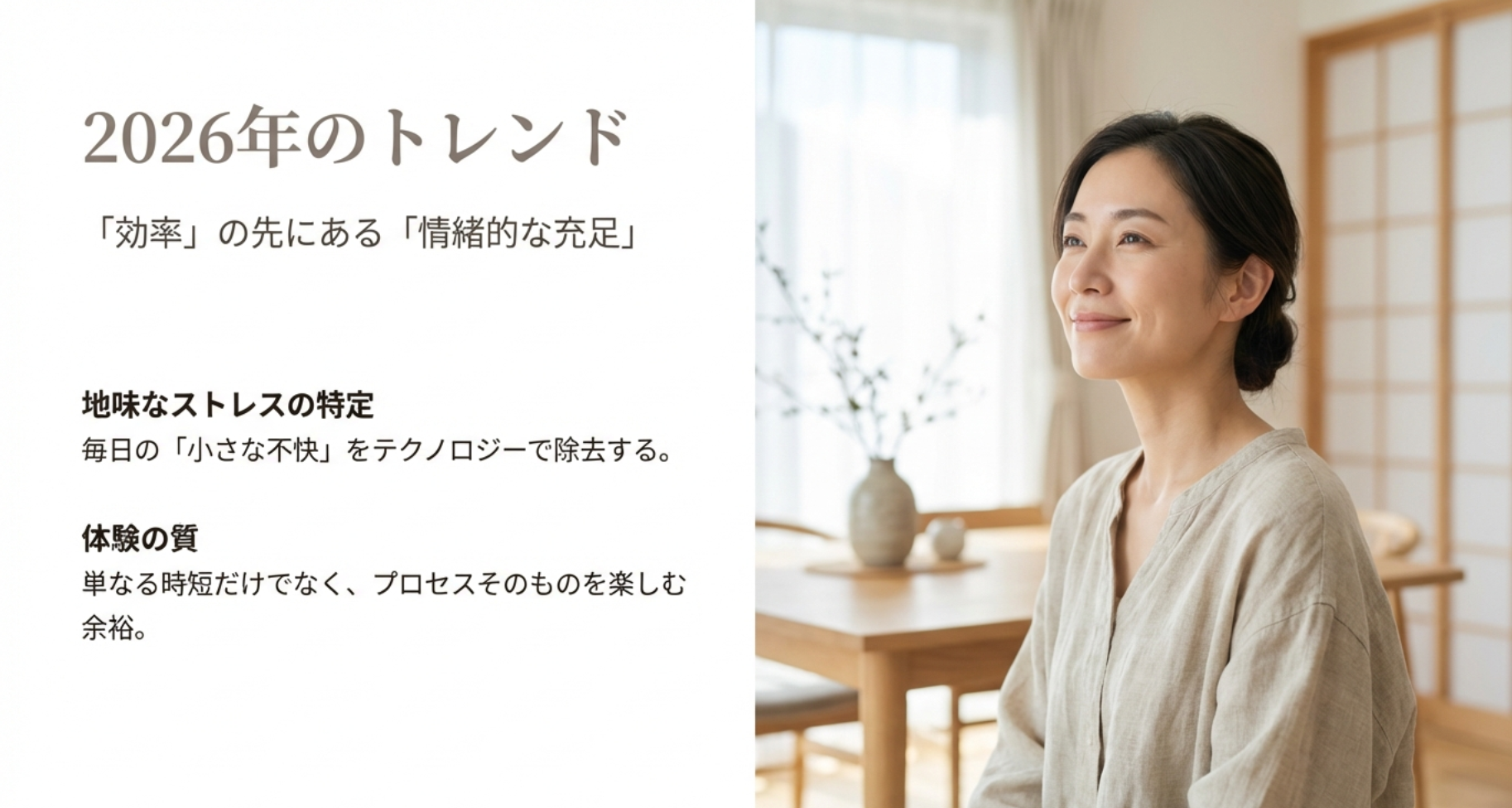 最近のトレンドとしては、単なる時短だけでなく「情緒的な充足」を重視する傾向が強まっています。2026年に向けて、消費者の関心は「効率」のその先にある「体験の質」へと移行しています。