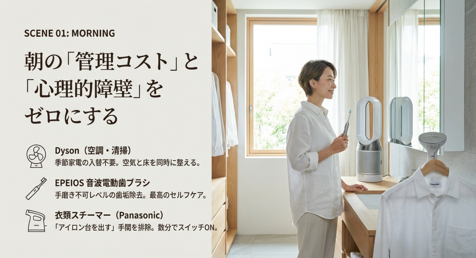 さらに、衣類スチーマーの活用も見逃せません。パナソニックの最新モデルなどは立ち上がりが非常に早く、ハンガーにかけたまま数分でシワを伸ばせます。「アイロン台を出す」という心理的障壁を取り除くだけで、朝の準備時間は驚くほどスムーズになります。パリッとした服に身を包むことで、仕事へのスイッチが自然と入る。これも立派なQOL向上の一環です。