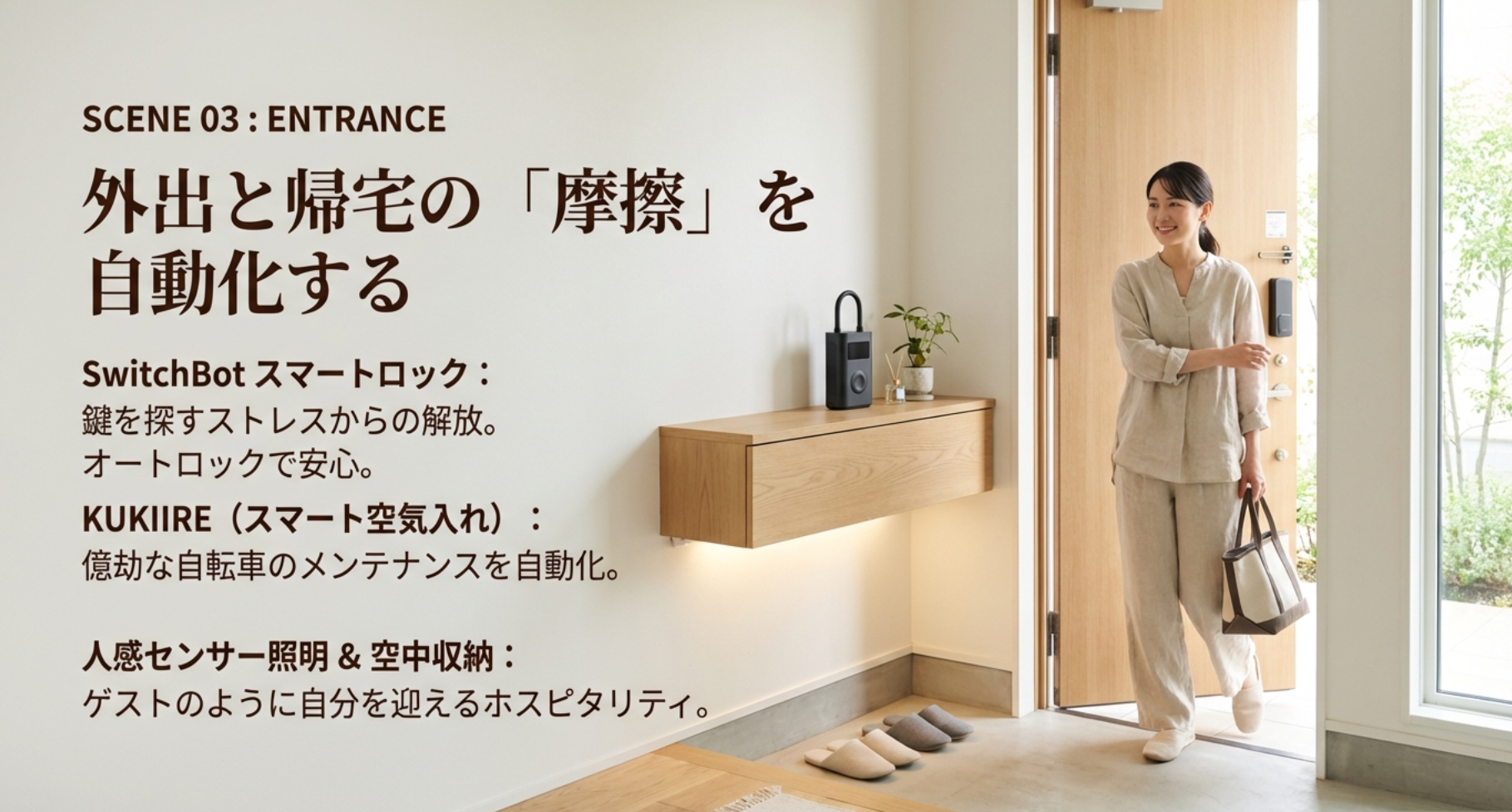 また、玄関に「人感センサー付きの照明」を取り付けるのも、非常に効果的なQOL向上策です。買い物帰りで両手が塞がっている時や、暗い夜に帰宅した際、パッと明かりが灯るだけで、安心感と利便性が格段に上がります。こうした「自動化」は、自分をゲストのように迎えてくれるホスピタリティをご自身に提供する行為でもあります。