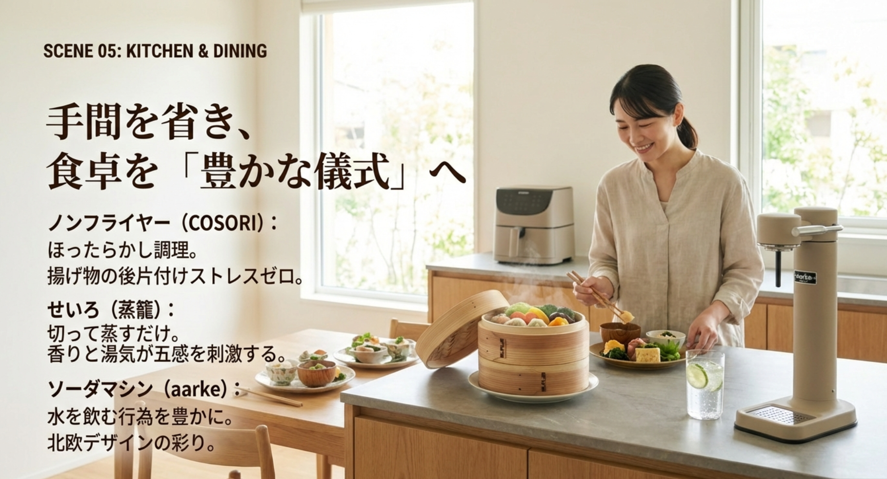 また、自宅でいつでも新鮮な炭酸水を作れる「aarke(アールケ)」のソーダマシンも、キッチンでの満足度を底上げしてくれます。ペットボトルの購入や廃棄の手間を省き、かつ北欧デザインの本体がキッチンを彩ることで、「水を飲む」という行為そのものが豊かになります。お風呂上がりや作業の合間のリフレッシュとして、炭酸水が常にそばにある生活は、QOLを一段階引き上げてくれます。