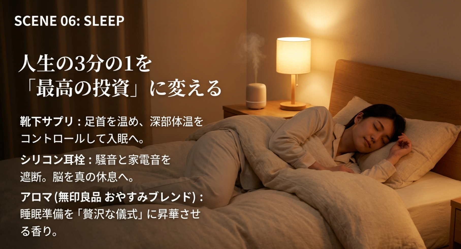さらに、嗅覚からのアプローチとして、無印良品の「おやすみブレンド」のようなエッセンシャルオイルも有効です。ベルガモットやオレンジの香りが、就寝前のルーティンを「単なる睡眠準備」から「贅沢な儀式」へと昇華させます。香りと睡眠の質の関係は科学的にも注目されており、自分に合った香りを見つけることは、ストレス社会を生き抜くための賢い選択と言えるでしょう。