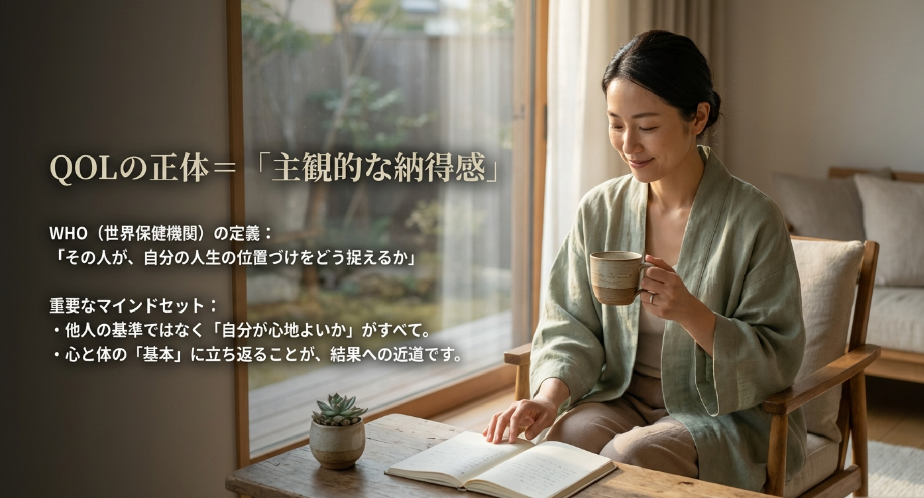 まずは土台作りから始めましょう。WHO(世界保健機関)の定義によれば、QOLとは「その人が、自分の人生の位置づけをどう捉えるか」という主観的な納得感のこと。つまり、他人の基準ではなく「自分が心地よいかどうか」がすべてなんです。
