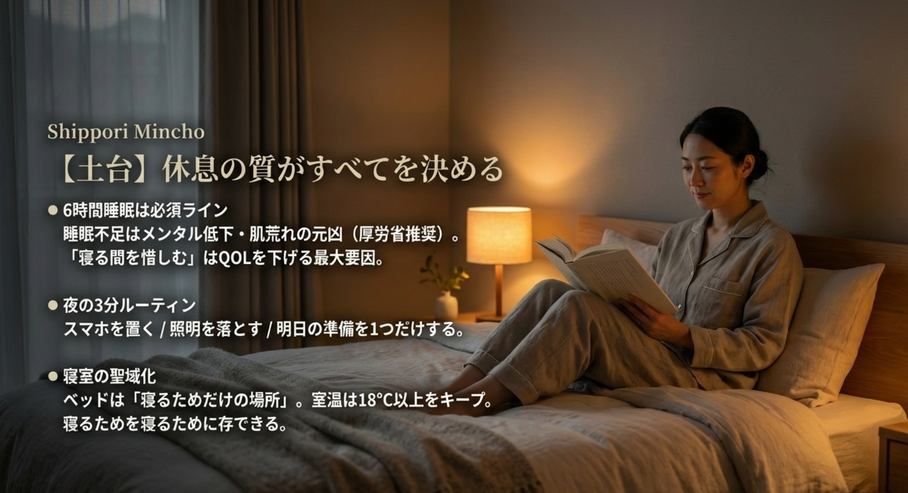 「寝る間を惜しんで頑張る」というのは、30代女性にとって最大のQOL低下要因です。厚生労働省のガイドラインでも、成人は6時間以上の睡眠を確保することが推奨されています。実際、睡眠不足は判断力を鈍らせるだけでなく、メンタルの不安定さや肌荒れに直結します。でも、ただ長く寝ればいいわけではありません。大事なのは「休息の質」です。
