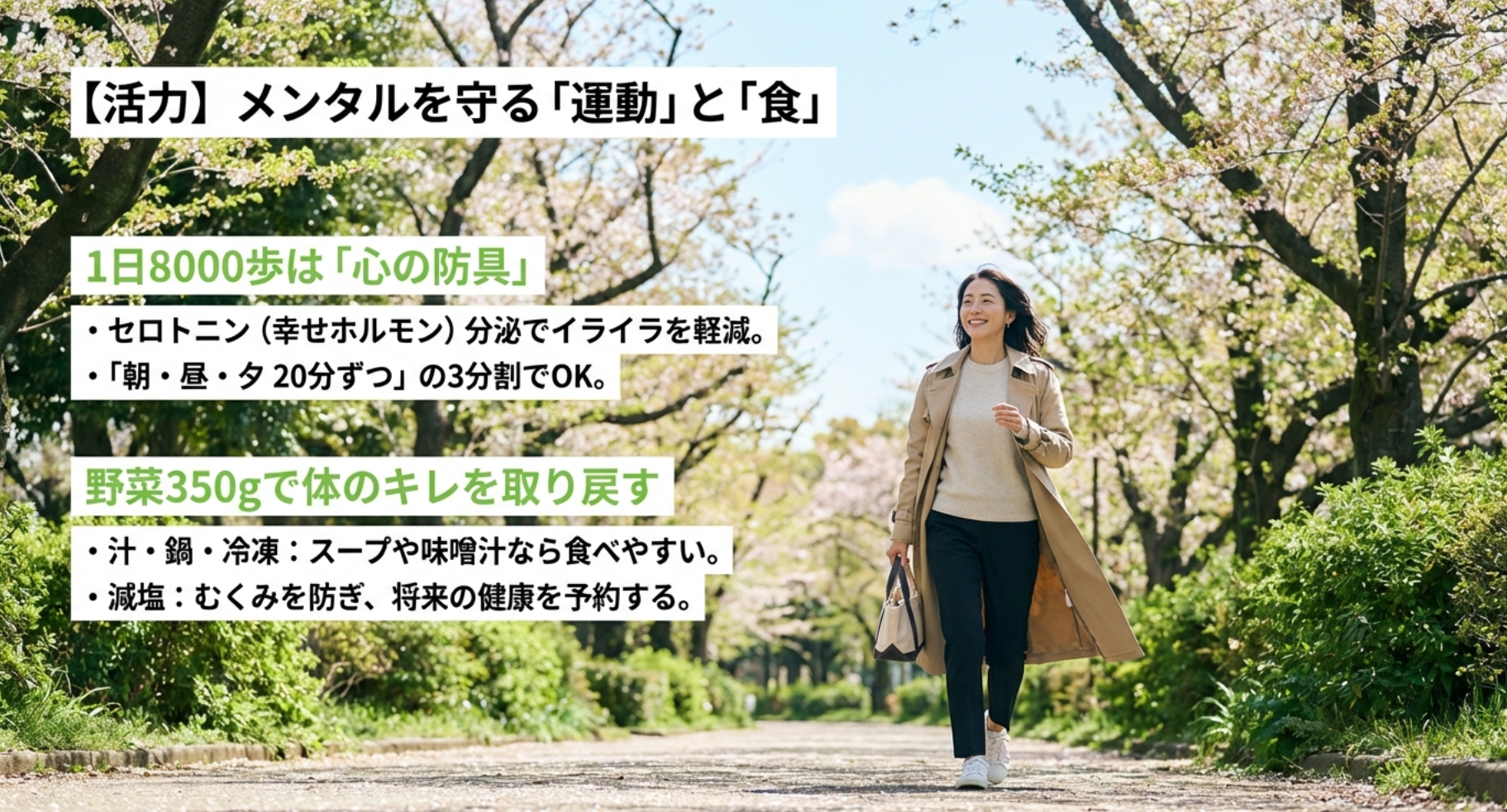 運動は「痩せるため」だけのものではありません。30代女性にとっての運動は「メンタルを守るための防具」です。最新の身体活動ガイドでは、1日60分以上(約8,000歩)の活動が推奨されています。歩くことで分泌されるセロトニンは、別名「幸せホルモン」と呼ばれ、日々のイライラや不安を物理的に軽減してくれるんです。