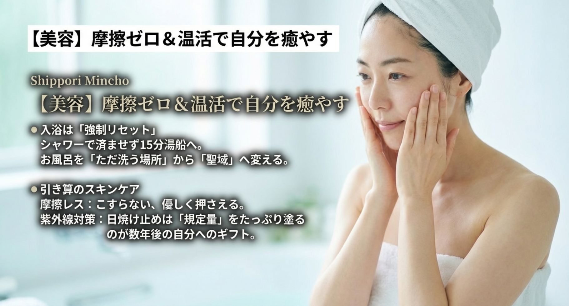 毎日戦っている私たちには「強制的なリセット時間」が必要です。その最有力候補がお風呂です。シャワーだけで済ませず、15分でも湯船に浸かることで、深部体温が上がり、その後の睡眠の質が跳ね上がります。お気に入りの入浴剤やキャンドルを用意して、お風呂を「ただ洗う場所」から「自分を癒やす聖域」に変えてしまいましょう。