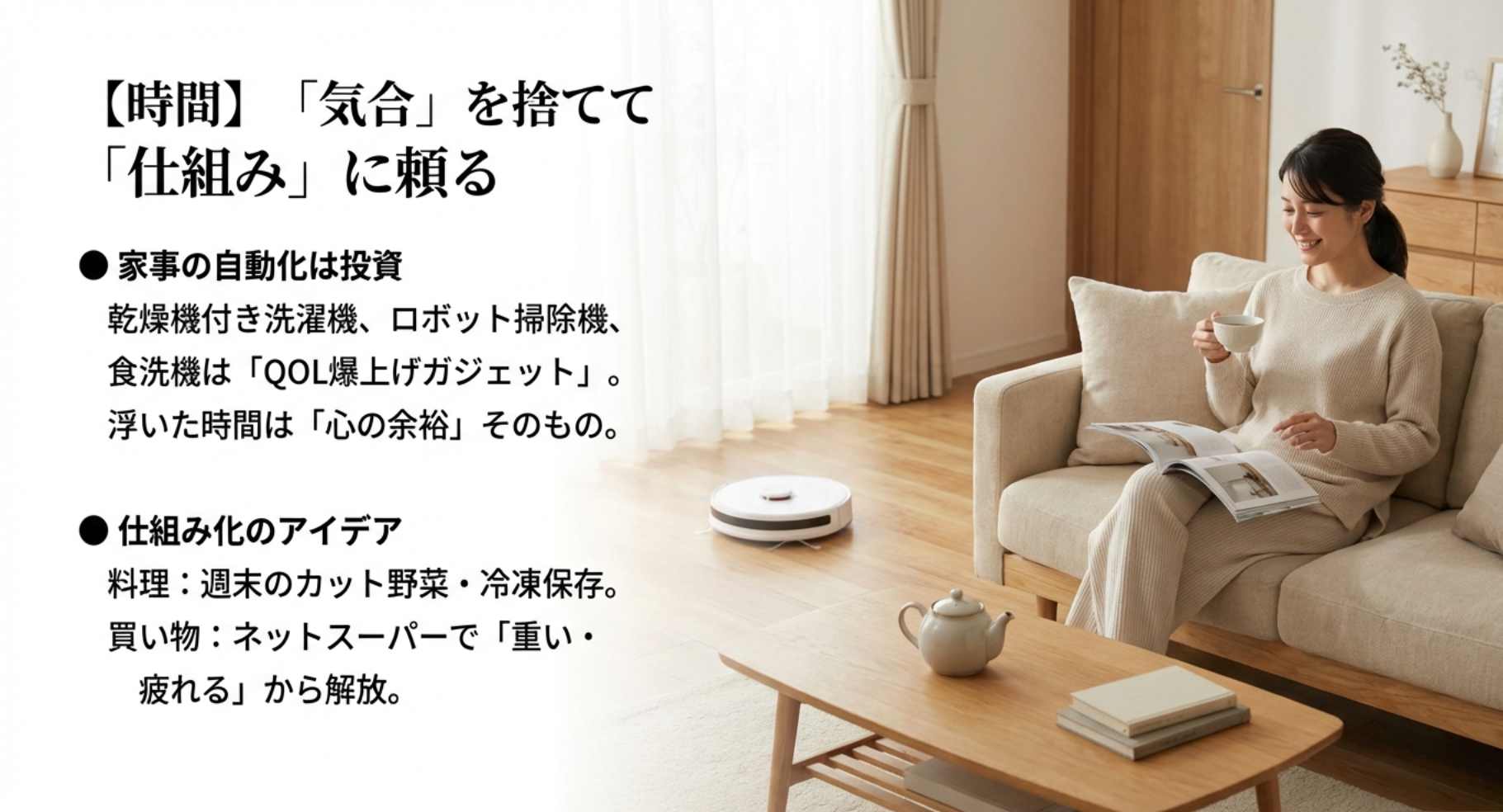 30代女性の最大の敵は「時間不足」です。家事や育児に追われて自分の時間がゼロになると、どんなに健康でも心は荒んでしまいます。ここで重要なのが「気合で頑張らない」こと。家事をいかに仕組み化し、手放すかが勝負です。