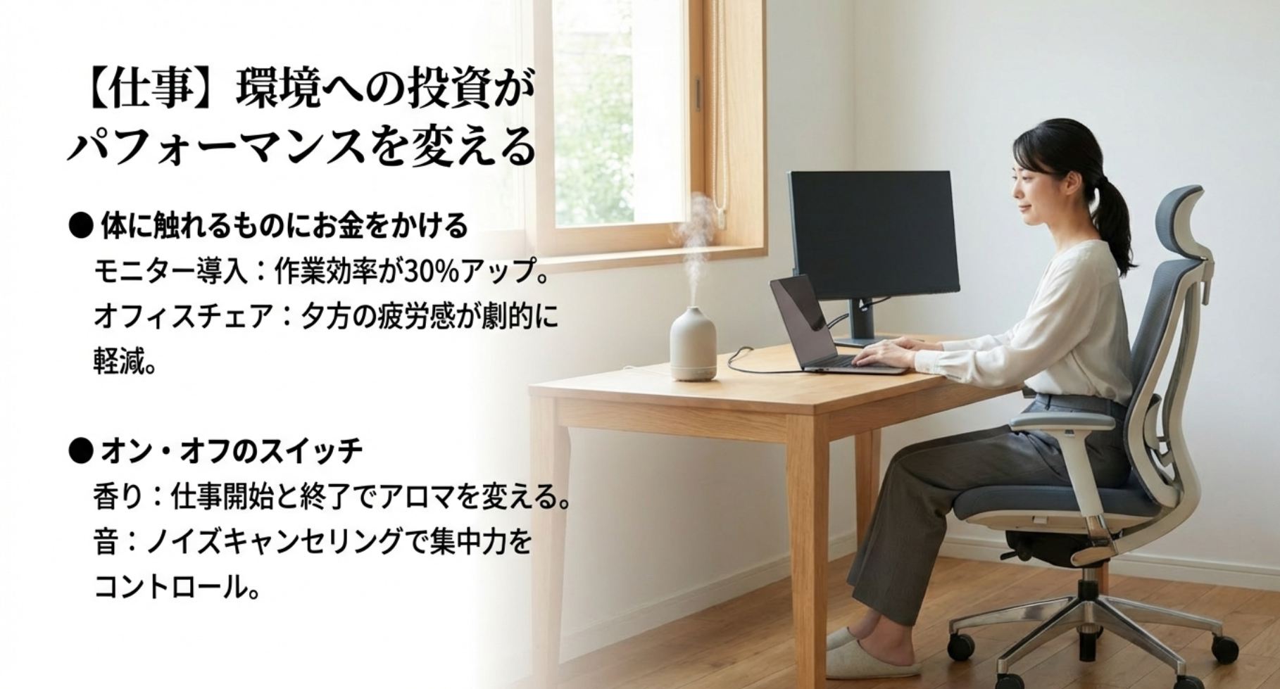 ノートPC1台で仕事をするのと、大きな外部モニターを導入するのでは、作業効率が30%以上変わると言われています。また、椅子をオフィス仕様のものに変えるだけで、夕方の疲労感が劇的に軽減されます。これは「買い物」ではなく、自分の健康と時間を守るための「先行投資」です。