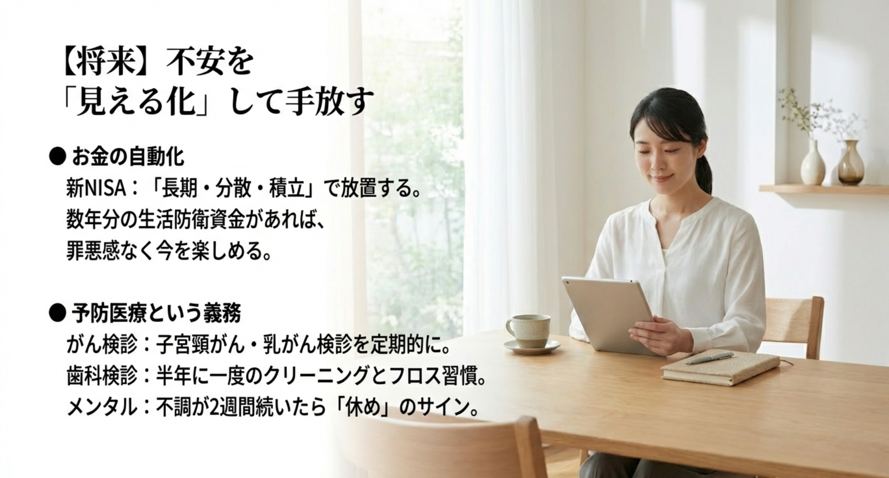 将来への漠然とした不安は、QOLを静かに蝕みます。30代のうちにお金の不安を「見える化」して、仕組みを整えておくことは、メンタルを安定させるための最強の薬です。まずは新NISAなどを活用して、少額からでも「自動で貯まる仕組み」を作ってしまいましょう。