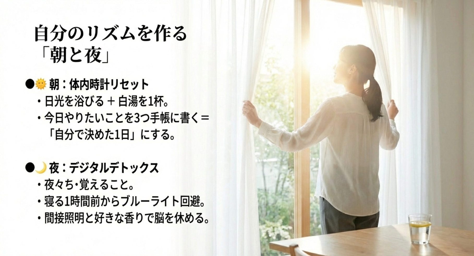 朝起きてすぐにカーテンを開け、白湯を1杯飲む。これだけで体内時計がリセットされ、夜の睡眠の準備が始まります。余裕があれば、今日やりたいことを3つだけ手帳に書く。これだけで、1日が「タスクに追われる時間」から「自分で決めた時間」に変わります。
